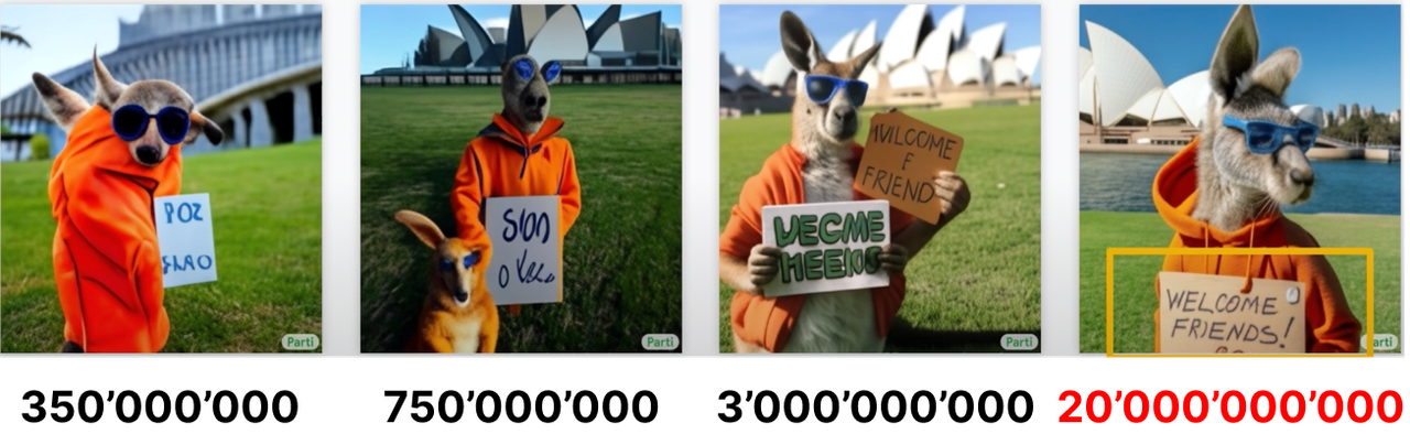 Biz qanchalik ko'p miqdordagi rasmni yedirsak shunchalik yuqori sifatdagi natijani olamiz. Masalan ushbu rasmda "Sidney Opera teatrining oldida o'tloqda turgan, to'q sariq kapyushonli va ko'k quyoshdan saqlovchi ko'zoynak taqqan kenguru ko'kragiga "Xush kelibsiz, do'stlar!" deb yozilgan belgi osgan portret surati." deb berilgan ta'rifga turli hajmdagi modullar chizgan rasmlari: