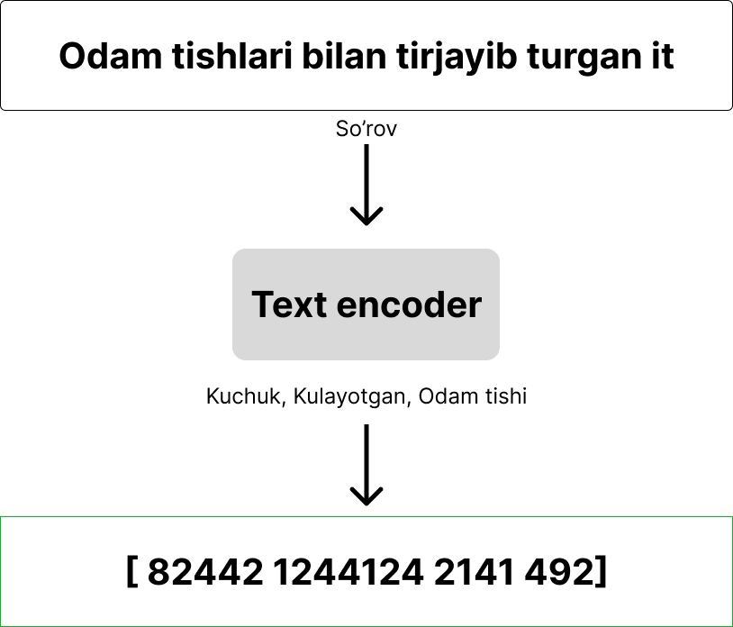 Ushbu ko‘rsatmani o‘ziga MATNNI KODLOVCHI (Text ensoder) oladi. Uning asosiy vazifasi uni diffusion modeliga u tushunadigan tilda yaʼni raqamlar shaklida tartibli qilib jo‘natishdir, masalan bizni ko‘rsatmani u "Kuchuk, Kulayotgan, Odam tishi" kabi holatga keltirib, so‘ng uni raqamlarga aylantirib uzatishi mumkin. Oddiy qilib aytganda xuddi tarjimon kabi so‘zlayotgan odamni nutqni tushunib tinglovchiga tushuntirishi kabi ishlaydi.