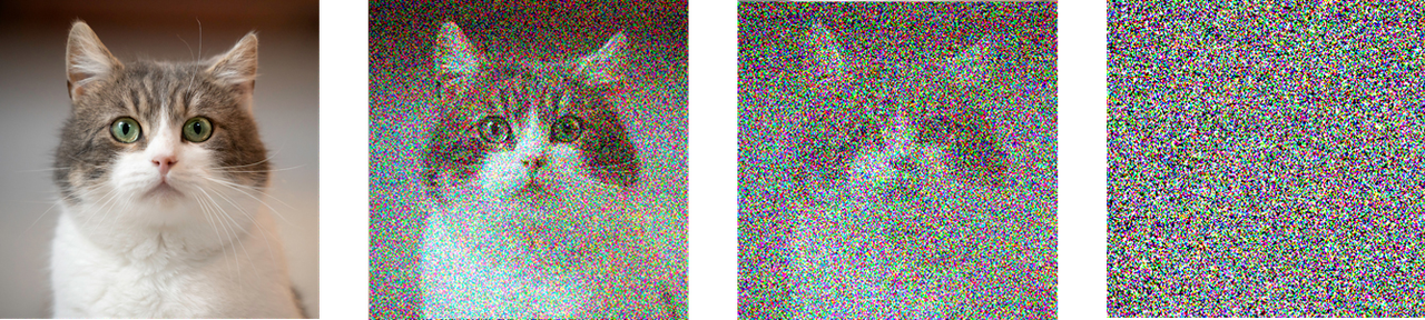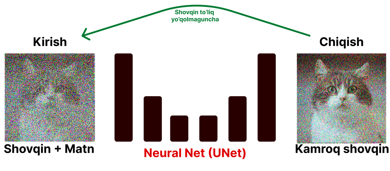 UNet shovqin va matnni qabul qilib oladi va ular asosida rasmdagi shovqin miqdorini kamaytiradi, va bu jarayon mutloq shovqin qolmaguncha davom etadi:
